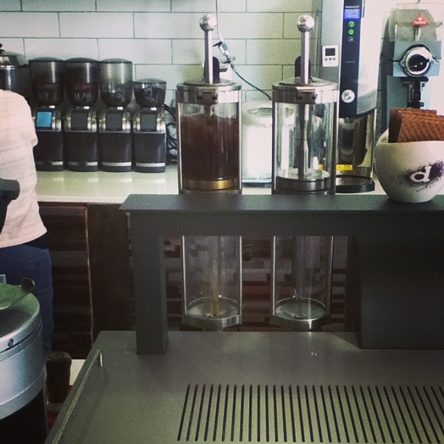 There is, as is evident from the pictures, one huge difference sitting on the center of the counter; the Alpha Dominche Steampunk Brewer. I had no idea they had purchased one before my visit and was ecstatic to finally get the chance to check one out. So, I sat and talked to the barista about the inner workings and usability of the machine (let alone the sweet design). I have been following the machine since about 2012 when I saw early prototypes out on the web. It seems to have gone through quite a few changes and the finished design is stunning. Truly, it is a work of art and a centerpiece to behold. But was a machine that promised to mechanize and largely automate siphon-brewed coffee going to revolutionize the way we have our beans? Aesthetically, sure, the machine throws down with other top end equipment. Now, these are just my observations over about a 20 minute span, so take it with a grain of salt, but it seems like the machine still has a few quirks. It is, apparently, quite difficult to clean and handle; the glass crucibles (as one of the designers called it) are rather delicate and must be worked around slowly, removing the pressing mechanism for cleaning takes time, and what we find is the only automation is pouring preset volumes of water and agitating the beans. This is great! With the right programming, it seems to work beautifully. But in terms of putting a cup out quickly, both automated and non-automated siphon processes still take a bit of time.